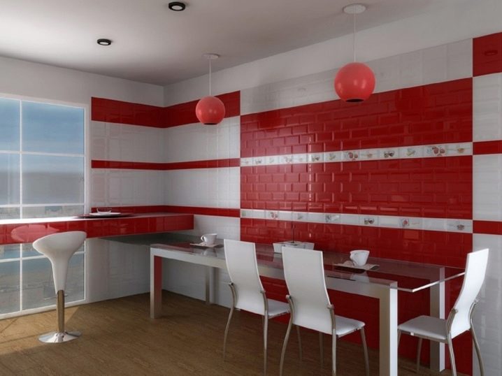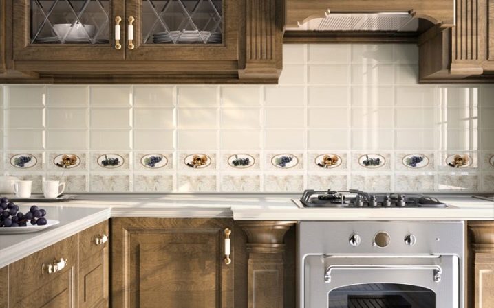 تستخدم أنواع مختلفة من بلاط السيراميك لتزيين المطبخ. بالنسبة للجدران في المطبخ الكبير ، من الأفضل اختيار البلاط المصقول. يبدو هذا السطح ممتعًا للغاية ، ولكن نظرًا للتألق اللامع ، تقل مساحة المطبخ بصريًا.