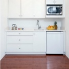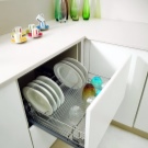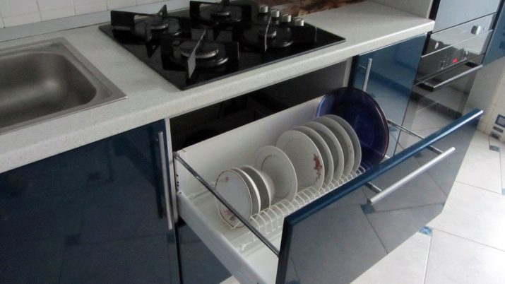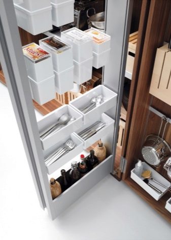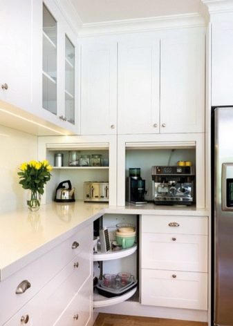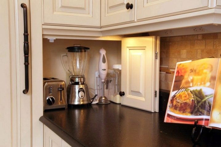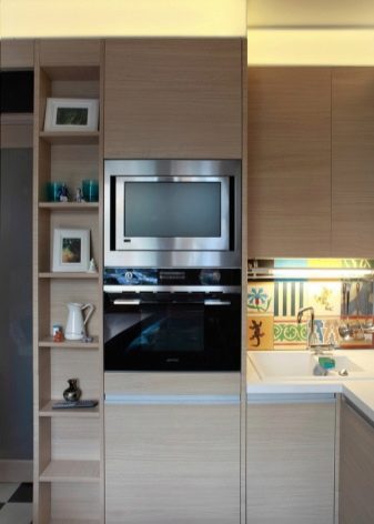 بشكل منفصل ، يجدر الحديث عن خزانات للأجهزة المدمجة. يمكن أن يكون هذا ثلاجة صغيرة وفرن ميكروويف وغسالة أطباق والمزيد. يتم تثبيت العديد من الأجهزة الصغيرة في الخزانة نفسها. يمكن تركيب الغسالة ببساطة تحت سطح الطاولة ، ولكن دون صنع علبة إضافية. بالنسبة للثلاجات ، اختر خزانة عمود خاصة. هذا المكان المناسب مناسب للمعدات من أي حجم..