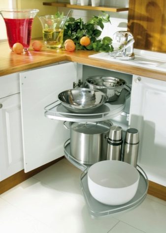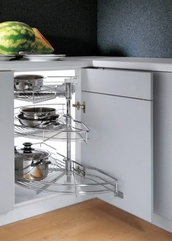 يجب إيلاء اهتمام خاص لخزائن الزاوية والنهاية. سيضيف الأول مساحة مفيدة ، لأن الزوايا غالبًا ما تُترك غير مستخدمة. وتوضع الخزانات الطرفية على طول حواف الهياكل المعيارية. يمكن لمثل هذه الخزانة ذات سطح الطاولة أن تحل محل سطح المكتب..
