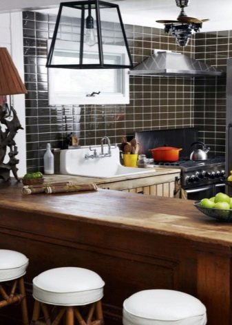 المطبخ المصمم على شكل “خنزير” أسود يبدو حديثًا للغاية ، خاصة إذا كان أثاث المطبخ يتناقض معه. يتماشى البلاط الأخضر جيدًا مع الطراز الريفي ، ويمكن القول أن الظلال الزرقاء تبدو مشرقة وتجذب كل الانتباه. لكن معظم ربات البيوت يفضلن مآزر حمراء أنيقة ومبهجة..
