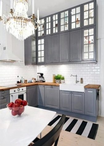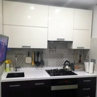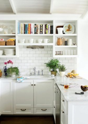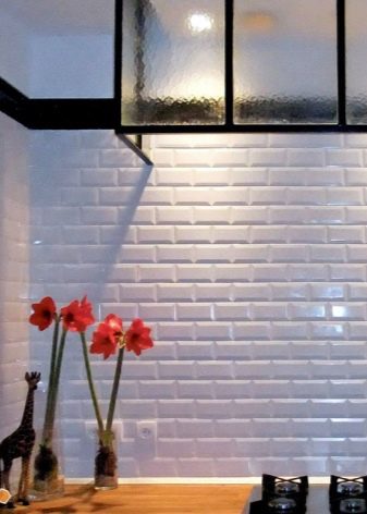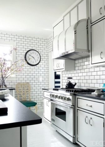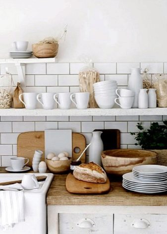 لذلك فإن المطبخ الأبيض مع ساحة من الطوب قد يسعد العين بجمالها الأبيض الثلجي ، علاوة على ذلك ، على خلفية بيضاء ، لن يكون التلوث على شكل غبار وأوساخ وبقع دهنية وبقع من المسح الرطب مرئيًا بشكل واضح. على بلاط مظلم. ميزة أخرى لبلاط الخنازير الأبيض هي أنه سيضيف جماليات وأناقة إلى مظهر المطبخ. إذا تم صنع البلاط الأبيض في ساحة المطبخ الصغير ، فستبدو مساحته بصريًا أكبر مما هي عليه في الواقع..