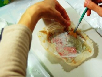 عند العمل مع القماش ، ستكون خوارزمية الإجراءات هي نفسها. إذا كان نسيج الديكور يميل إلى الانهيار ، فيمكن تلطيخ الحواف قليلاً بالغراء. يتم تقويم القماش على البلاط ومغطى بالغراء. عند تزيين البلاط بقطعة قماش ، يمكن استخدام المادة اللاصقة بدون تخفيف. يمكنك أيضًا استخدام ورنيش عديم اللون للصق الزخرفة على بلاط السيراميك..