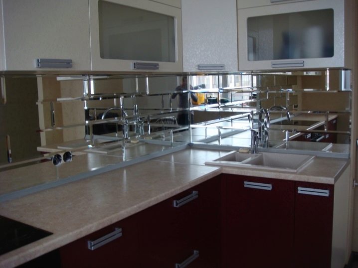 بلاط المرآة ، على عكس المرايا الهشة ، له عدد من المزايا.. من السهل جدًا الاعتناء بها. بسبب هذا البلاط ، يمكنك إنشاء تصميم مطبخ مذهل. الأسطح المرآة تزيد المساحة بصريًا.