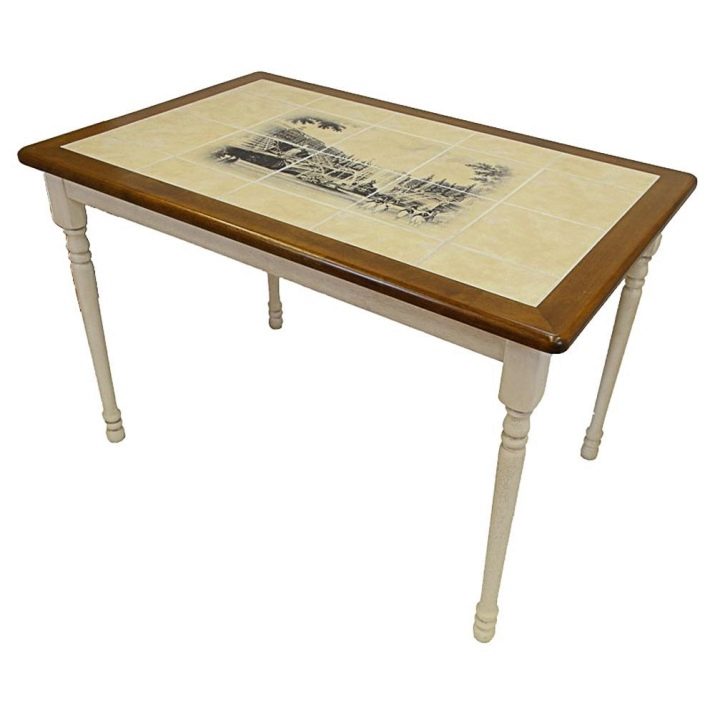 طاولة المطبخ مع بلاط السيراميك أو البلاط هي الأكثر متانة في الجانب المنزلي. يتميز باستقرار ممتاز وعملي. بفضل استخدام البلاط ، تتميز هذه المنتجات بتصميمها الأصلي الأنيق وتكمل بشكل مثير المظهر الداخلي للمطبخ. توجد أحجام قياسية ويتم تصنيعها حسب الطلب وفقًا للقياسات الفردية.