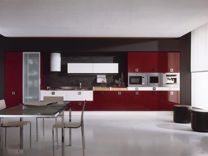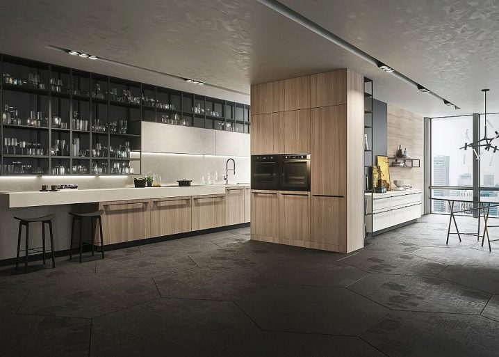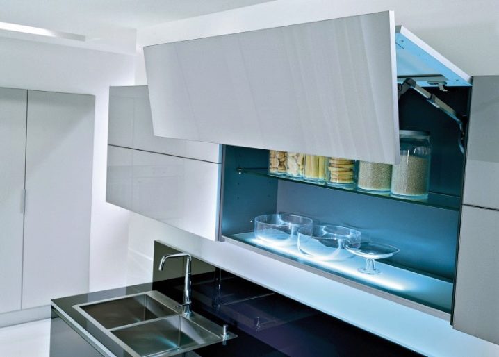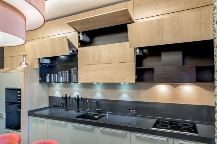 باتباعًا لنصائح المصممين ، يمكنك الجمع بنجاح بين الأرفف والأرفف المفتوحة وأثاث الخزانة. اتجاه آخر عصري هو عدم وجود مقابض علوية لواجهات العرض وأبواب الخزائن. هذه الخزانات ، كقاعدة عامة ، لديها نظام دفع وفتح..