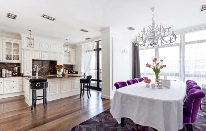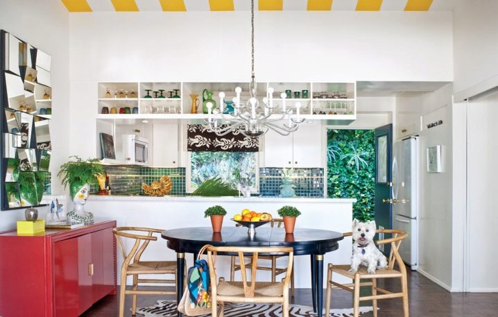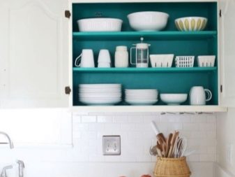 تتناسب الأرفف ذات الزجاج اللامع أو المصنفر والأرفف المطلية بالكروم مع التصميم بنجاح. يتم اختيار خزانات الأطباق ، كالعادة ، بأرفف مفتوحة..