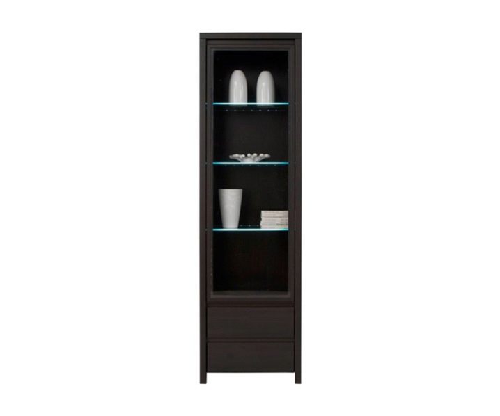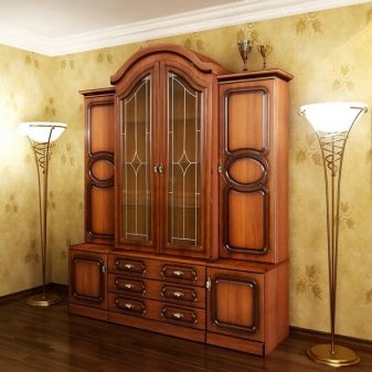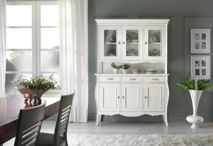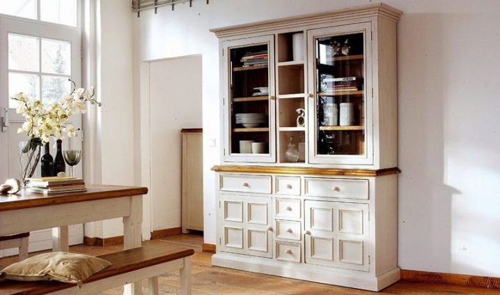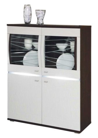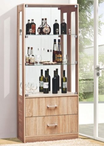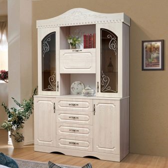 هذا المنظر مشابه للخزانة الجانبية ، ولكن تحته وفيه عدة أقسام. في ذلك ، يمكنك تحديد مكونين: الجزء العلوي بأبواب زجاجية والجزء السفلي – خزانة ذات أدراج. لا يوجد مكان مفتوح في الوسط.