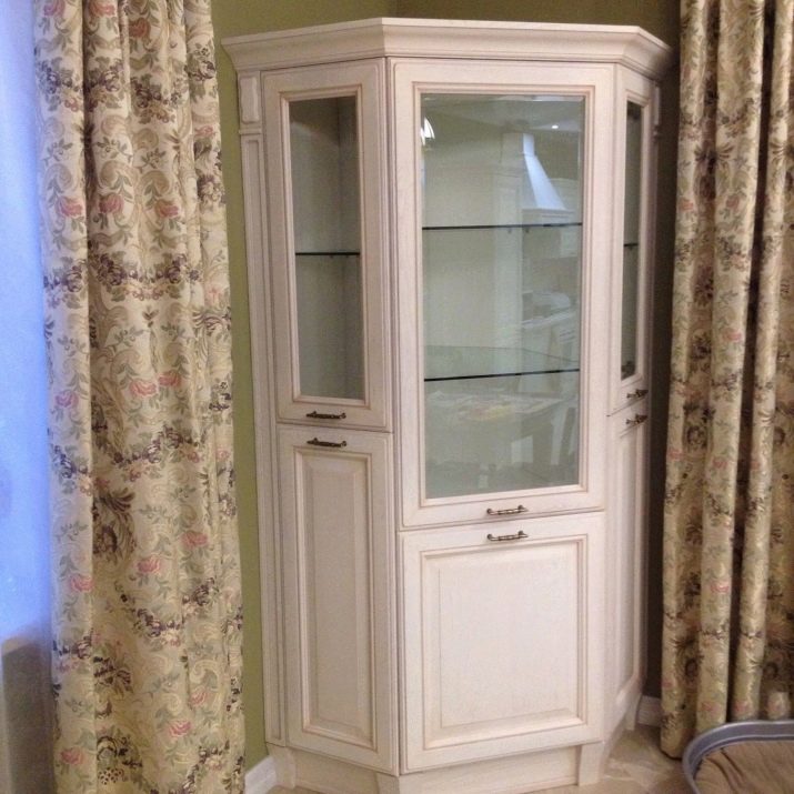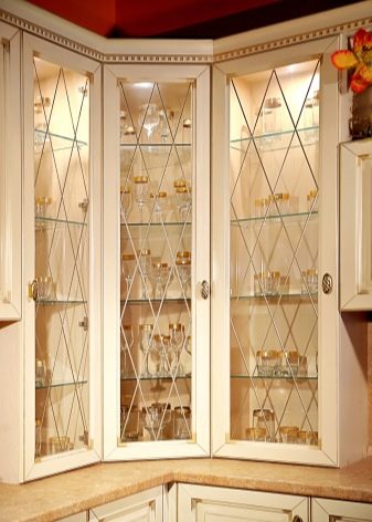 نوع مختلف من الخزانة الكلاسيكية ذات الشكل الأصلي. في مثل هذه الخزانة ، يمكنك ترتيب الأطباق بشكل مائل ، مما يسمح لك بمراقبتها من نقاط مختلفة في المطبخ. يشغل مساحة صغيرة ، وهو فسيح للغاية ، ويضيء فراغ الزاوية ويتناسب بشكل جيد مع سماعة الرأس الرئيسية.