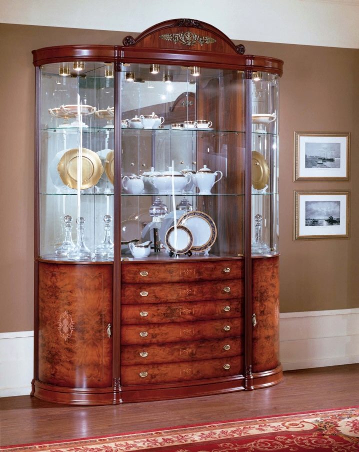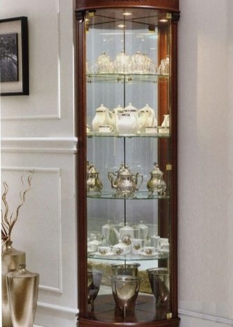 نوع من الخزانات الجانبية ، يختلف في أن الجدران الجانبية مصنوعة من الزجاج. بالإضافة إلى ذلك ، تتميز بواجهة غير مستوية: فهي مرتفعة في الجزء المركزي ، وتنخفض على الجانبين.