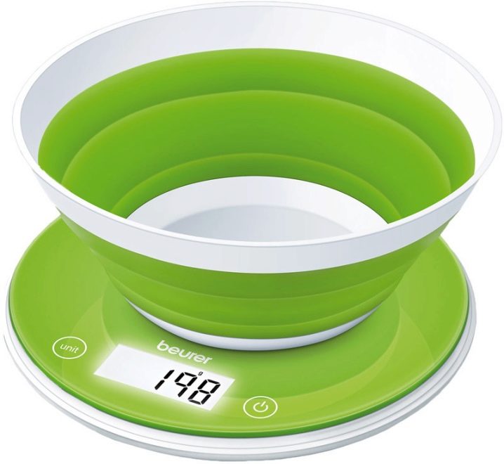 - بيورير. الموازين الإلكترونية ذات وعاء بتصميم لاكوني لها وظيفة صفرية ، ويمكن أن تتحمل وزن المنتجات حتى ثلاثة كيلوغرامات ، وهي مصنوعة من الفولاذ المقاوم للصدأ.