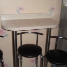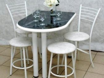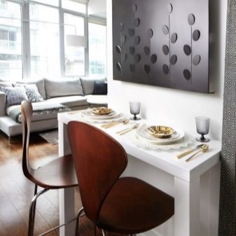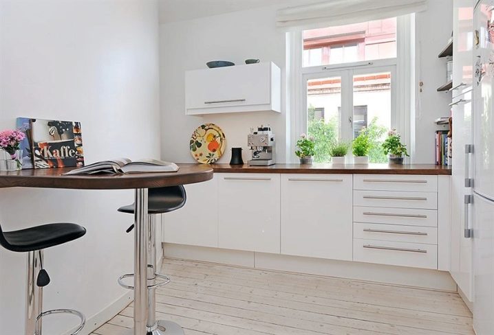 في الوقت نفسه ، نظرًا لاختلاف أطوال سطح الطاولة وعرضه ، يمكن أن يبدو النموذج مختلفًا تمامًا. يمكن أن يكون نوعًا من عداد القضبان الموجود على طول الجدار أو بارز للأمام. يمكن للجدول تقليد الرف أو يشغل مكانًا صغيرًا مخصصًا له تمامًا. كل هذا يتوقف على حجم المطبخ والتصميم الداخلي.