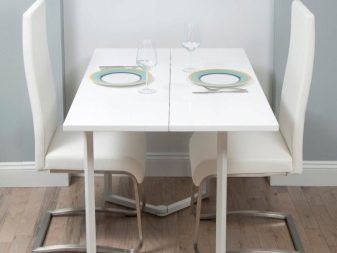 إذا كنت تتناول الطعام عادة مع شركة صغيرة ، ولكن في بعض الأحيان تجمع شركات كبيرة في المنزل ، فإن خيارك هو نموذج محول. تتسع هذه الطاولة الصغيرة القابلة للطي لاستيعاب المزيد من الأشخاص.