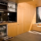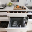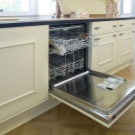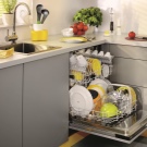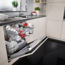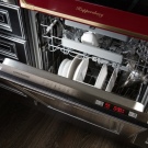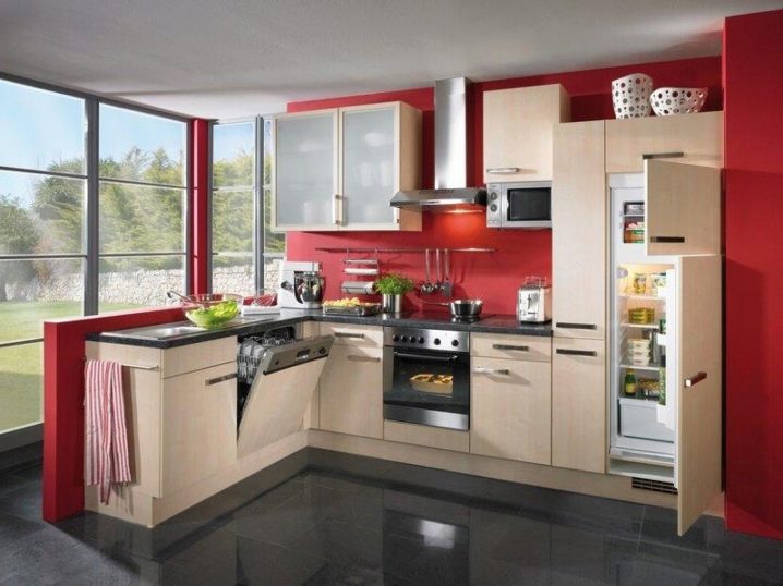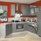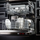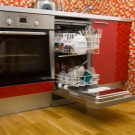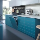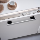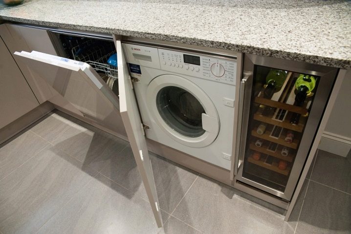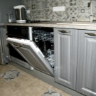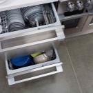 يمكن وضع الطرز صغيرة الحجم بسهولة على الغسالة في حالة النقص الحاد في المساحة. لكن من الأفضل عدم وضع غسالة الصحون المدمجة على سطح العمل بجوار الموقد. من المهم أن تناقش مع الشركة المصنعة للأثاث إمكانية تركيب غسالة أطباق أسفل الموقد وتحت الحوض وبجوار الثلاجة..