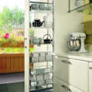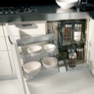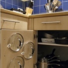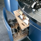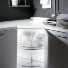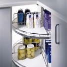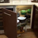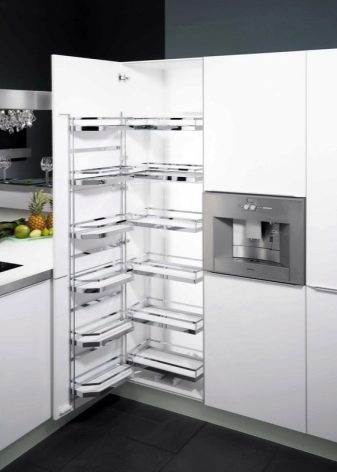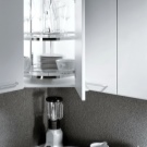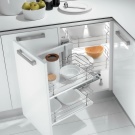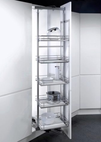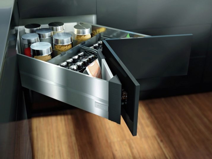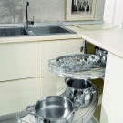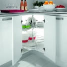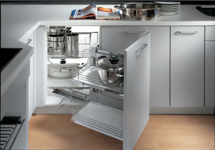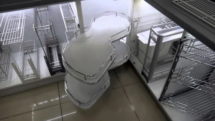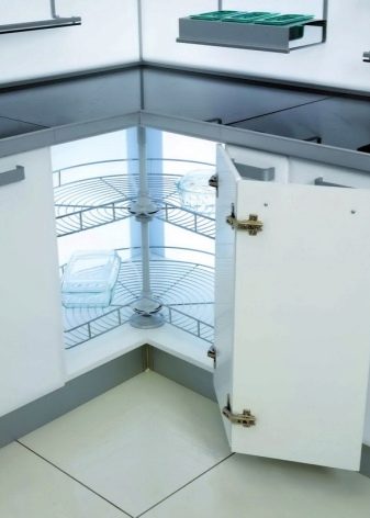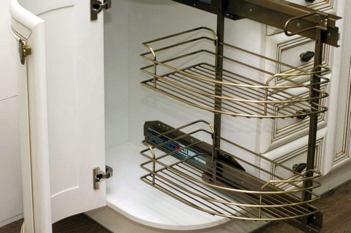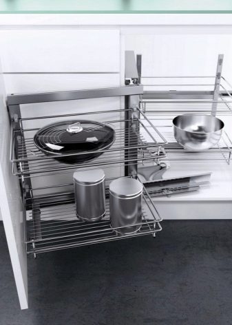 يقدم مصنعو إكسسوارات المطبخ حلاً جيدًا لوحدات الزاوية السفلية والعلوية في شكل آلية تخزين تسمى “الزاوية الذكية”. يتكون التصميم من سلتين شبكيتين بقاعدة صلبة ، موضوعة واحدة فوق الأخرى ، مما يسمح بتحمل عشرات الكيلوغرامات من الوزن. يتم توصيل جزء من النظام بمقدمة الخزانة ، مما يسمح للهيكل بأكمله بالانزلاق على طول القضبان عند فتح الباب.