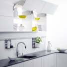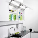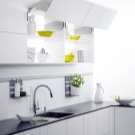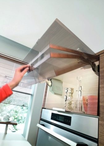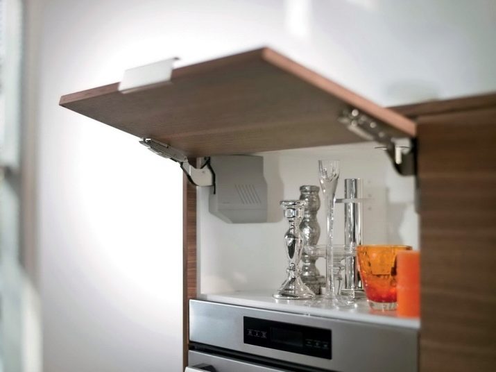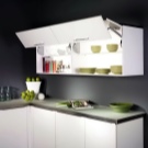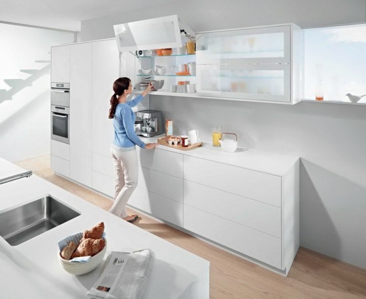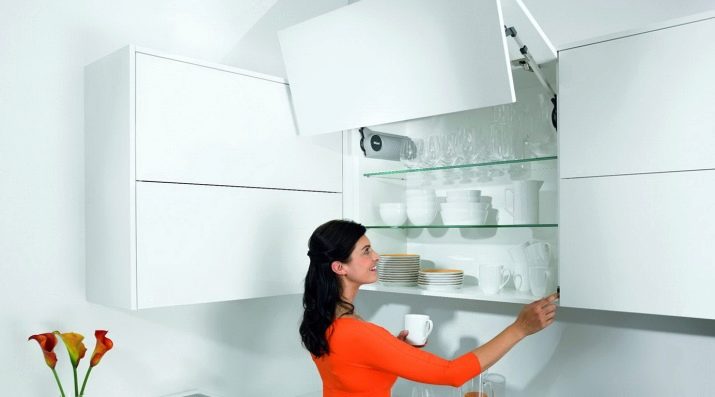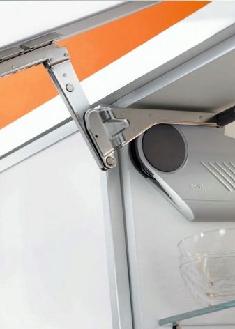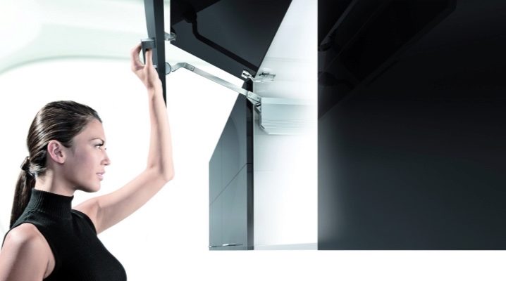 لا تقتصر المطابخ الحديثة على الأبواب المفصلية. بمساعدة آليات الرفع المريحة التي يمكنها تحمل الأحمال الثقيلة وتوفير المساحة بشكل كبير ، يمكنك توفير أي طريقة لفتح الخزانة ، على سبيل المثال ، في مستوى عمودي لأعلى. هناك نماذج للمصاعد توفر التشغيل المستقل بدون مفصلات.