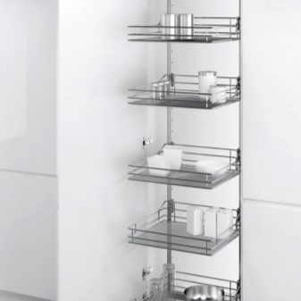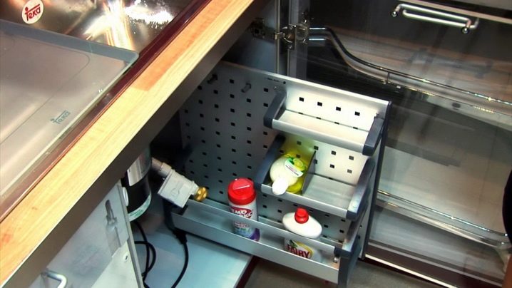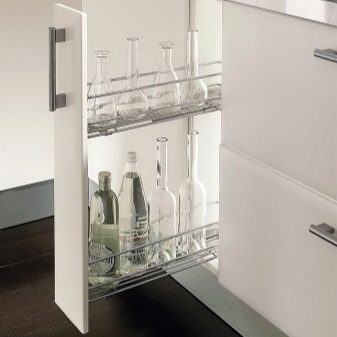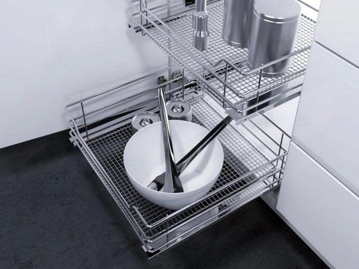 للاستخدام الرشيد ، يمكن تجهيز الخزانات الأساسية بسلال شبكية من الفولاذ المقاوم للصدأ. راحة الحاوية الشبكية الواسعة هي أنها مرئية من جميع الجوانب وتسمح لك بالعثور على العنصر المطلوب بسرعة. يمكن تجهيز سلة البضائع على دعامات الأسطوانة ، كبديل للدرج ، بحامل للزجاجات والمواد الكيميائية المنزلية والصواني.