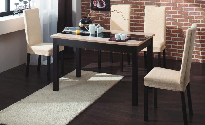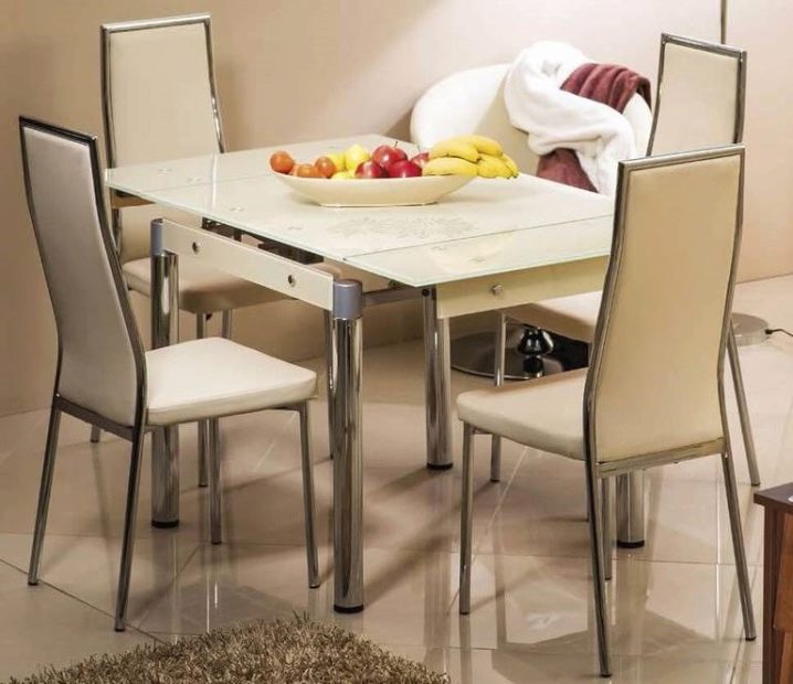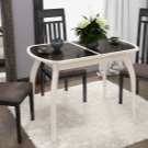 يعود اختيار المواد الرئيسية إلى الجزء الداخلي من المطبخ: بالنسبة إلى الشكل الكلاسيكي ، يتم اختيار النماذج الخشبية لأثاث تناول الطعام مع مزيج محتمل من البلاط ، والطاولات الزجاجية مناسبة تمامًا للمساحة البسيطة..
