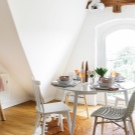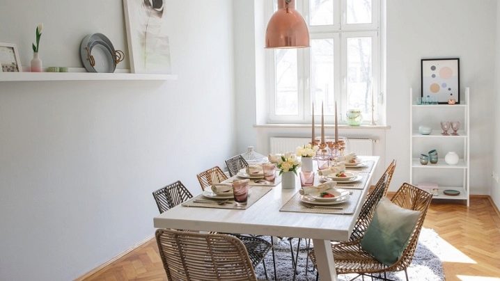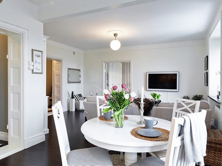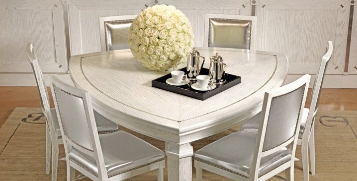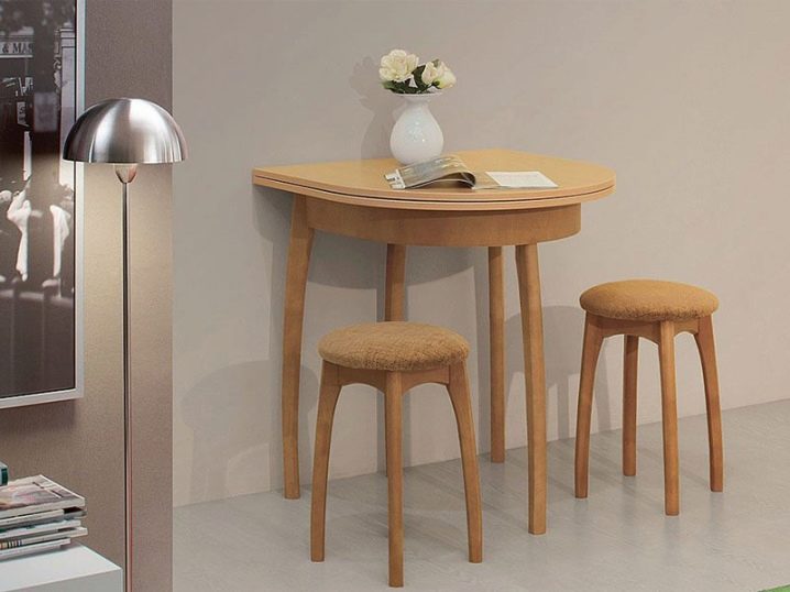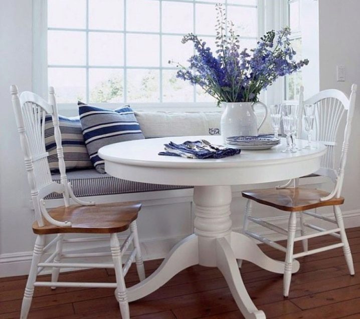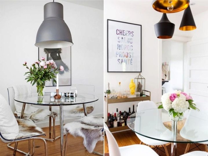 تبدو الطاولات الصغيرة المستديرة والمثلثة مناسبة في المناطق الداخلية حتى للمطبخ الواسع ، إذا كان هناك شخصان فقط يعيشان في شقة أو منزل ، ولا يحتاجان إلى مساحة ضخمة لتناول الطعام.
