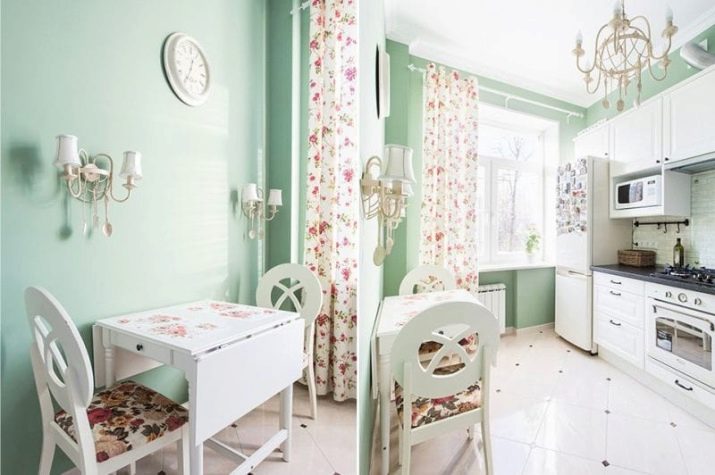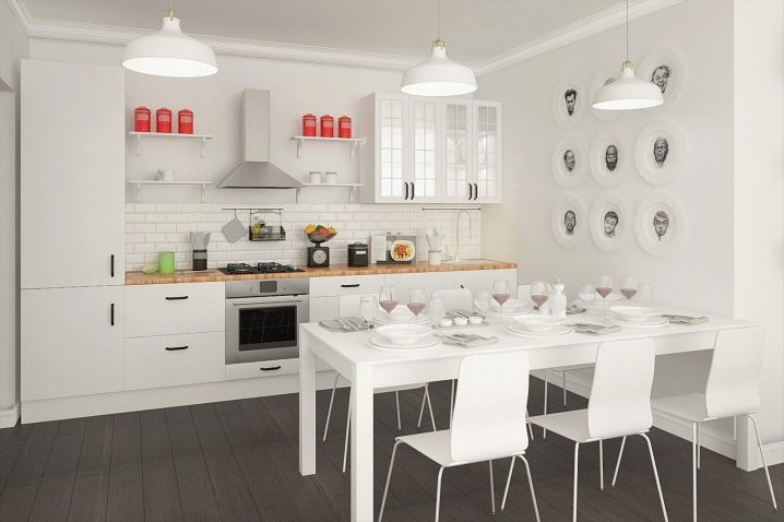 يمكنك إنشاء مساحة مضيئة تمامًا مع باقي الأثاث الأبيض (مجموعة المطبخ ، والكراسي ، والخزانة ذات الأدراج) وتنويعها بلمسات مشرقة – ستائر متنوعة ، وديكورات من الزهور الطازجة أو التشطيبات الداكنة – الأرضية.