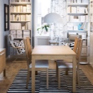 يبدو أثاث Ikea في الداخل مقتضبًا بشكل خاص إذا اخترت النموذج المناسب لتصميم مساحة المطبخ. انتبه إلى الشكل العضوي لطاولة مستطيلة خشبية بيضاء بسيطة في مطبخ واسع ، حيث يسود أنقى وأنبل الظل..