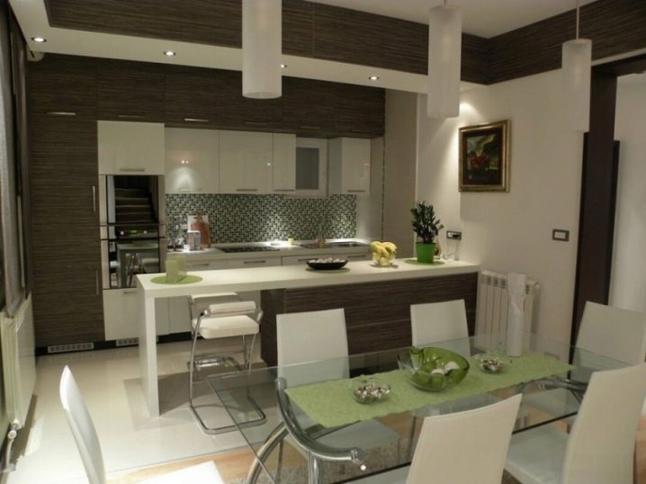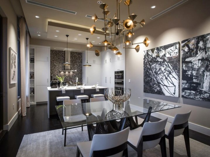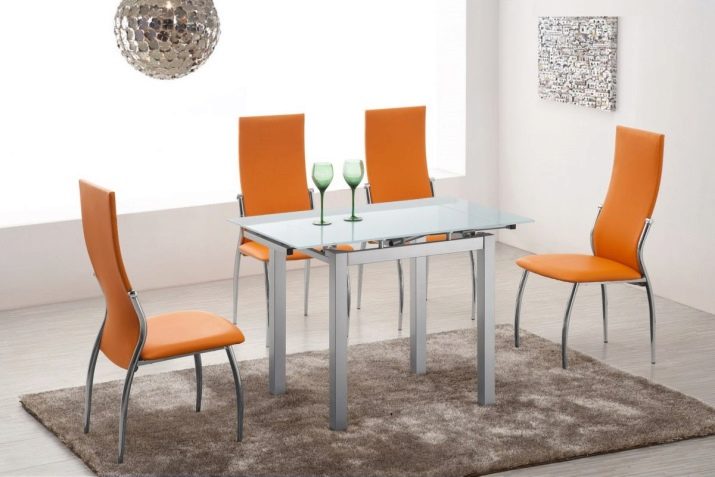 يبدو الأثاث الزجاجي جيدًا في مساحة المطبخ الكبيرة ويمنح الغرفة مساحة أكبر ، ومن المناسب استخدام طاولة قابلة للطي في مطبخ صغير.