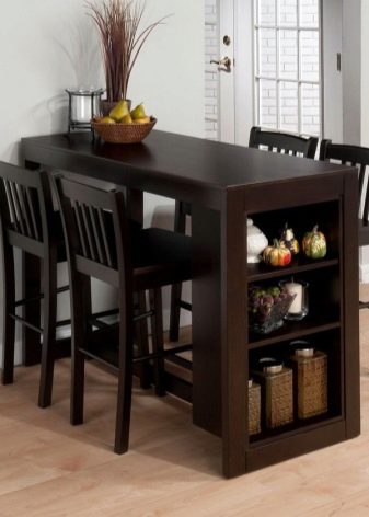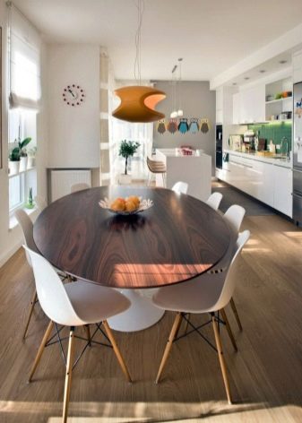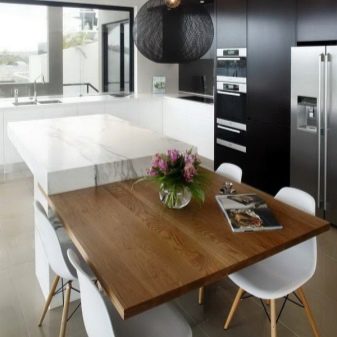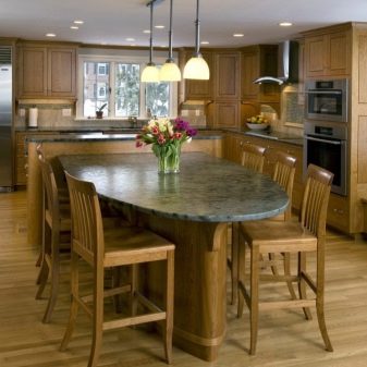- يُنصح باختيار موديلات الأثاث الحديثة البيضاوية والمستديرة العالية إذا كان هناك أطفال في الأسرة ، حيث لا يحتوي الأثاث على زوايا حادة ويعمل كعنصر آمن في الشقة. تبدو الأسطح البيضاوية والمستديرة متناغمة في المطبخ الواسع ، لأنها تتطلب مساحة أكبر لوضعها وتسمح لك باستيعاب المزيد من الضيوف.