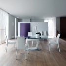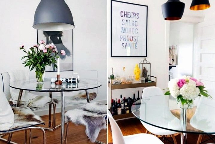 سطح الطاولة الزجاجي المستدير مناسب للشكل الحديث لغرفة الطعام ؛ المنسوجات أو وسائد الفراء على الكراسي ستساعد على تنويع الأثاث “متجدد الهواء”. الصورة 2