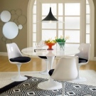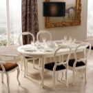- سيكون اللون الأبيض للطاولة مناسبًا للداخل من أي مقياس واتجاه ، من المهم اختيار شكل سطح الطاولة وأرجلها: للأسلوب الكلاسيكي والرومانسي ، اختر أثاثًا مستديرًا أو بيضاويًا على ساق واحدة ضخمة أو مستطيلة نماذج بالبلاط. للحصول على تصميم داخلي بسيط وعالي التقنية ، ستكون النماذج البلاستيكية ذات السطح اللامع أو مع طباعة الصور مناسبة.