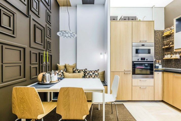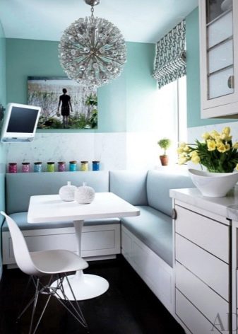 - اعتمادًا على حجم غرفة تناول الطعام في المطبخ ، يتم اختيار أثاث بحجم كبير أو صغير. بالنسبة للمطبخ الصغير في خروتشوف ، فإن الأثاث ذو الشكل المربع أو المستطيل مع المعلمات ، على سبيل المثال ، الطول والعرض 80 × 80 سم أو عرض لا يقل عن 50 سم ، مناسب.