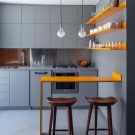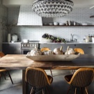تقليديا ، توضع طاولات الطعام على الحائط في منطقة طهي موازية ؛ يتيح لك هذا الأسلوب عدم إضاعة المساحة الخالية واستخدام الطاولة “بالكامل” لوصول الضيوف وإبعادها عن الحائط..