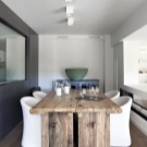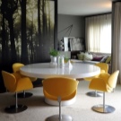 وضع سطح طاولة مستطيل بالقرب من منتصف الغرفة سيسمح بمربعها الكبير ؛ تقليديا ، يتم وضع الطاولة على بعد 1-1.5 متر من الحائط لتوفير مقاعد إضافية. بالمناسبة ، يسمح لك الوضع العقلاني لطاولة الطعام بوضع عدد أكبر أو أقل من الأشخاص خلفها ، على سبيل المثال ، 6 أشخاص سيتناسبون خلف قطعة أثاث مستطيلة مقاس 120×80 سم في مكان “مجاني” من الحائط ، ولكن إذا إذا قمت بتحريك الطاولة بالقرب منها ، ستنخفض السعة بمقدار شخص واحد فقط.