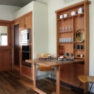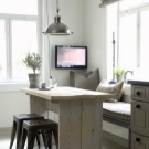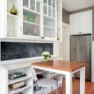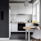 ستكون الطاولة المستطيلة الضيقة مع درج بآلية قابلة للطي خيارًا عمليًا لشقة أو استوديو من غرفة واحدة ، ضعها موازية أو متعامدة مع المجموعة النهائية لمجموعة المطبخ.