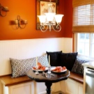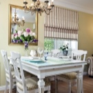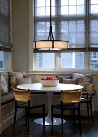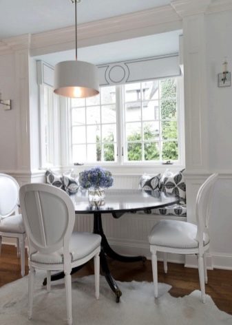 يتيح لك الموقع بجوار النافذة جعل منطقة تناول الطعام مشرقة ومرحبة ؛ تعد النافذة في المطبخ ظاهرة ممتعة في حد ذاتها ، وسيبدو النموذج المستدير للأثاث على ساق واحدة ضخمة أكثر فائدة (للديكور الداخلي الكلاسيكي أو الإنجليزي ، أي رومانسي أو ريفي).