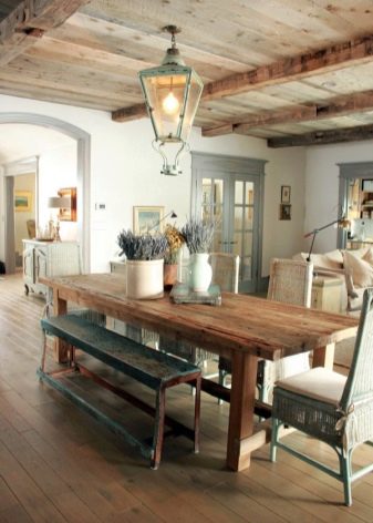 يجب ألا يكون الجدار فوق طاولة الطعام فارغًا ، وإلا فإنه سيحرم الداخل من الكمال والسحر. في المناطق الداخلية الريفية ، ستكون الأرفف أو الألواح المفتوحة ذات الإطارات الخشبية الضخمة ذات الظل الأبيض أو الخشبي مناسبة. لن تصبح الأرفف مجرد زخرفة للغرفة ، بل ستكون أيضًا كائنًا وظيفيًا لتخزين الأطباق والتوابل والزيوت وعلب البقالة والهياكل المفصلية من النوع المفتوح والتي يتم دمجها تمامًا مع الزهور والشمعدانات وكتاب الطبخ والديكورات الأخرى.