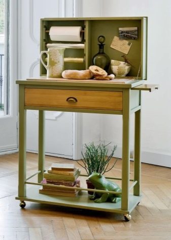 بالنسبة للشقق الصغيرة ، فإن طاولة قابلة للطي على عجلات مناسبة أيضًا ، والتي يمكن دفعها مقابل الحائط بحيث يكون سطحها فوق منطقة حامل الأرضية ، وعندما يأتي الضيوف ، يمكن إخراجها إلى الغرفة أو في منتصفها. المطبخ.