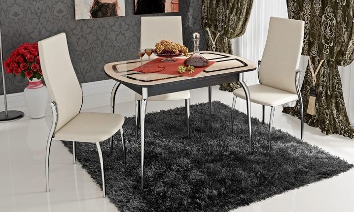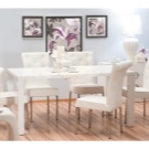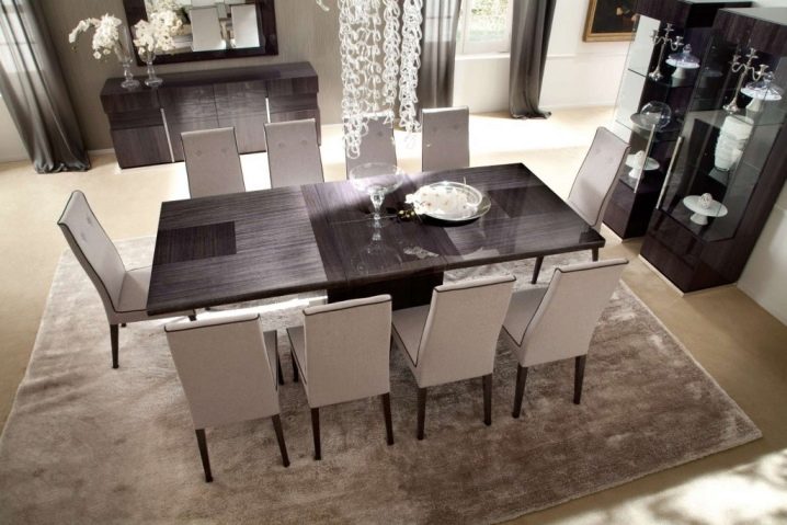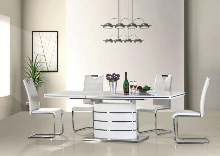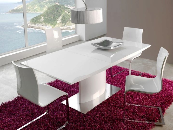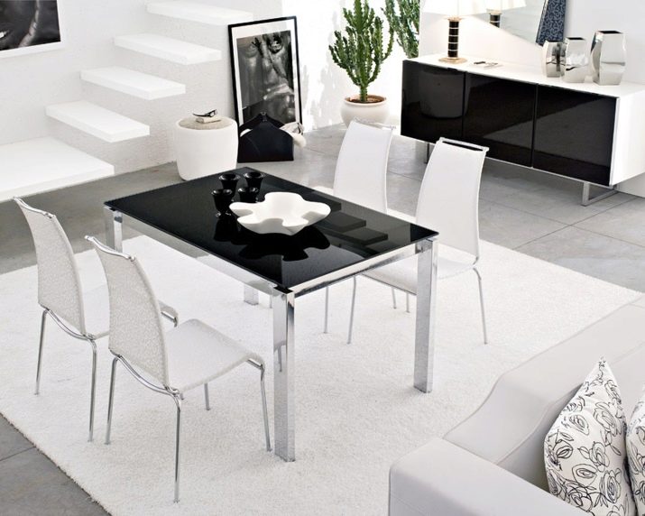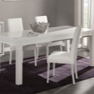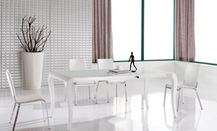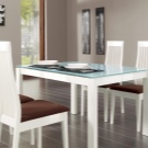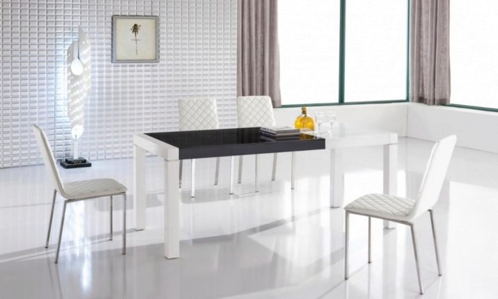 يتطلب سطح الطاولة المستطيل ذو السطح اللامع كراسي مطابقة: إذا كان غطاء الأثاث باردًا ، فيجب استكماله بأشياء “رائعة” – الكراسي ، والعكس صحيح. يختار خبراء الراحة الكراسي ذات الظهر المرتفع المستقيم أو المنحني قليلاً والمقعد الناعم المصنوع أساسًا من الجلد. بالمناسبة ، يمكن أن تحتوي جميع عناصر المقعد التي تلمس الشخص على تنجيد ناعم ، وستبدو رائعة مع طاولة لامعة..