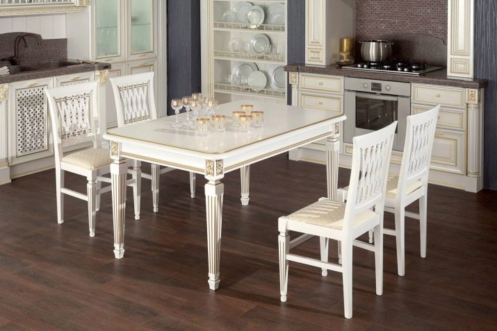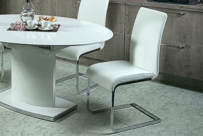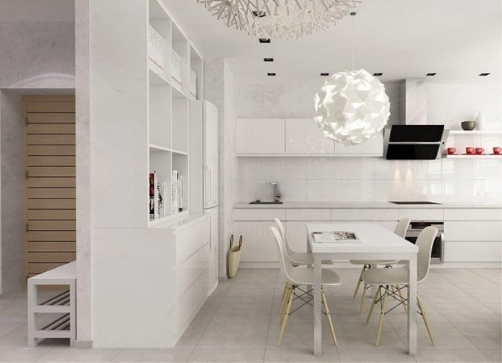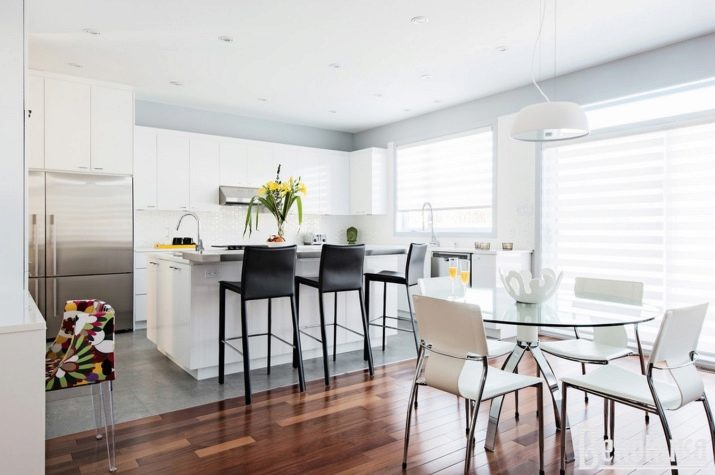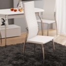 لن يستغني المطبخ الحديث باللون الأبيض عن الكراسي الخفيفة ذات الدعم المعدني والمقاعد الصارمة ذات اللون الأبيض الثلجي. تقليديا ، يتم اختيار الأثاث الصلب للغرف الحديثة ، والتي قد تبدو غير مريحة في الحياة اليومية..