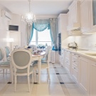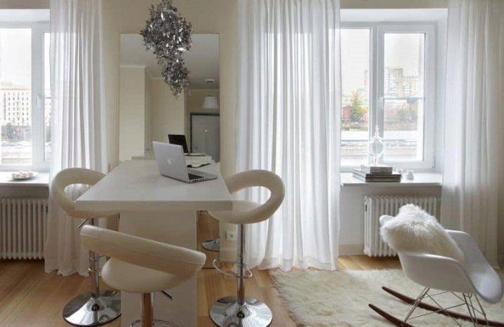 - يتم اختيار المنسوجات الخفيفة للعناصر البيضاء في منطقة تناول الطعام: ستائر فضفاضة جيدة التهوية ، تول ، مناديل قطنية.