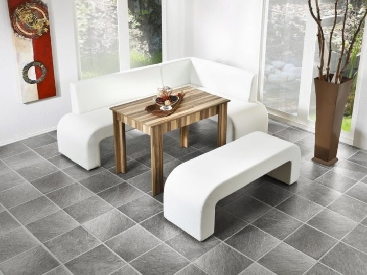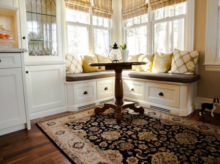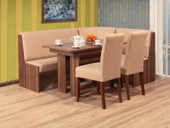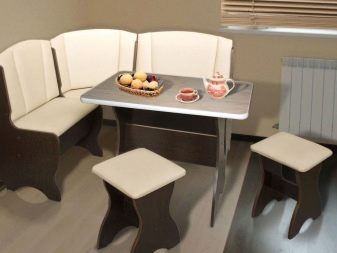 إذا لم يكن هناك مساحة إضافية في المطبخ ، فيمكنك استخدام مقاعد ناعمة مدمجة. سيكون الظهر جدارًا أو دعامة عصامية. عند اختيار المقاعد الناعمة ، يجب أن تأخذ في الاعتبار عرض وطول المقاعد بحيث “تناسب” قطعة الأثاث هذه حتى في أصغر مطبخ صغير.
