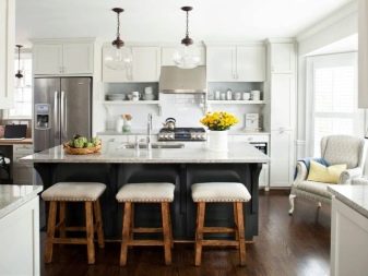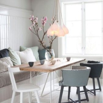 كقاعدة عامة ، يتم ضبط الكراسي في المطبخ بحيث يمكن للمضيفة أن تستريح لمدة دقيقة على الأقل أثناء الطهي. وماذا يمكن أن يكون أكثر راحة من الكرسي؟ في الوقت نفسه ، يمكن أن يصبح هذا العنصر ركنًا مريحًا للراحة وتفاصيل داخلية مشرقة..