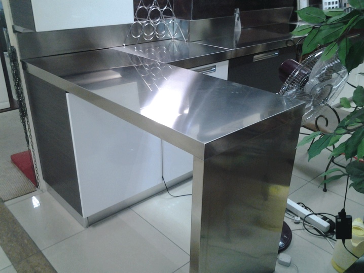 أحد الخيارات الأكثر إثارة للاهتمام هو طاولة الفولاذ المقاوم للصدأ. أسطح المطبخ مقاومة للرطوبة وسهلة التنظيف ومتينة. بالمقارنة مع الأنواع السابقة ، تتمتع موديلات الفولاذ المقاوم للصدأ بمستوى جيد من مقاومة الحرارة. الميزة الرئيسية للمادة هي أنها لا تصلح للأحماض العدوانية..