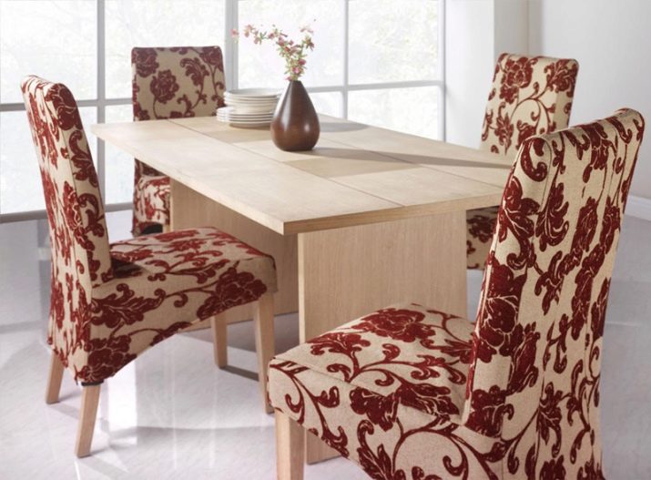 يشغل الجزء المركزي من تصميم المطبخ طاولة طعام ، وبالطبع الكراسي. هناك العديد من عناصر الزخرفة ، من بينها أيضًا التنجيد المتنوع للكراسي. ومع ذلك ، فإن إحدى ميزات المطبخ هي زيادة خطر التلوث. يجب حماية أي أثاث هنا تقريبًا بشكل إضافي ، لأنه بين الحين والآخر يمكن أن ينسكب شيء ما أو يسقط في المطبخ..