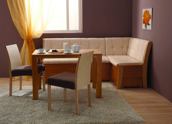 الأريكة هي أحد الحلول الأكثر شيوعًا للمطبخ من أي حجم. هذه المقاعد مريحة للغاية وتوفر مساحة بسبب موقعها على طول الجدار. تحت المقاعد ، كقاعدة عامة ، توجد صناديق لتخزين أدوات المطبخ وتفاهات أخرى. يمكن استخدام الأريكة الصغيرة كمنطقة جلوس إضافية.