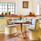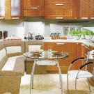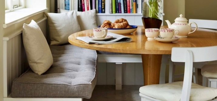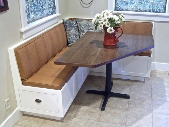 في المطبخ الحديث ، ستبدو الأريكة الجلدية الضخمة والأريكة المدمجة ، المنجدة بمنسوجات بسيطة بأسلوب عتيق ، جيدة. المحدد "سرير قابل للطي", التي يتم استخدامها بشكل مستمر ، وعادة ما يتم استكمالها بجدول مقابل. خيار جيد هو طاولة مع عجلات ، والتي يمكنك دفعها جانباً بسهولة كل ليلة. غالبًا ما تأتي هذه الجداول مع الزاوية نفسها..