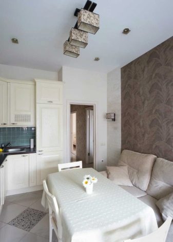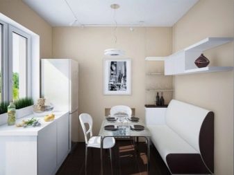 مساحة الغرفة 9 متر مربع. م ، يستوعب أريكة مريحة يمكن وضعها على طول الحائط. تسمح لك المشاريع الفردية بوضع أي عناصر وظيفية في الغرفة ، بما في ذلك الهيكل المريح والمريح. ينصح المصممون ، عند اختيار الأثاث المنجد للمطبخ ، بإيلاء اهتمام خاص لمادة ولون المنتج. سيتم تزيين غرفة صغيرة بنماذج خفيفة يمكن حمايتها بغطاء.