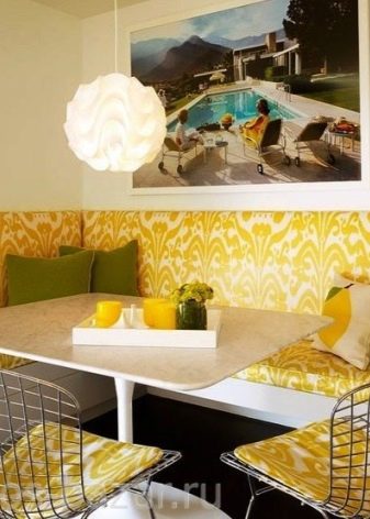 بالنسبة للغرفة العادية ، تعتبر طباعة المفروشات الزاهية والنمط الهندسي والشريط مناسبة. في ذروة الموضة اليوم ، اللون الأرجواني هو اللون. بالنسبة للأثاث ، من الأفضل اختيار حشو صناعي. يبدو مزيج الأثاث المتباين والجدران الفاتحة جميلًا في الغرفة. ينصح المصممون بالاهتمام بالنمط البيئي ، الاسكندنافي ، التكنولوجيا الفائقة ، الدور العلوي. يتم تلطيف هذه الأنماط بواسطة أريكة مطبخ ناعمة ستبدو مناسبة في منطقة تناول الطعام..