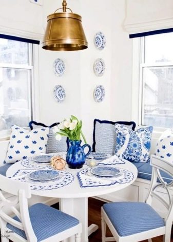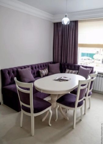 تعتبر أريكة المطبخ على طراز بروفانس حلاً ممتازًا للديكور الداخلي الذي تهيمن عليه التأثيرات الفرنسية. أفضل الألوان للأثاث المنجد في هذه الحالة هي أرجواني ، وردي باهت ، بودري ، خوخي ، أبيض. المطبوعات الزهرية أو الرتابة المطلقة هي السمات الرئيسية لأسلوب بروفانس. يجب أن تكون الأريكة الحديثة في مثل هذا الجزء الداخلي ناعمة بالضرورة وأن تكملها الوسائد..