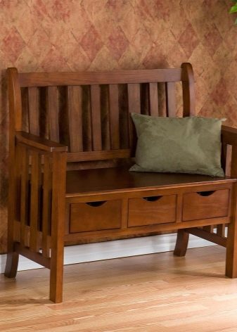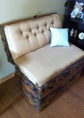 يتم توصيل الجوانب باستخدام قضبان أفقية ، ثم الهيكل الخلفي مصنوع من الخشب الرقائقي. في المرحلة النهائية ، من الضروري إرفاق المطاط الرغوي به. تتكون المقاعد من لوحين متوازيين و 4 ألواح متعامدة ، متصلة بمسامير خاصة ، ويتم تزيين الحزام بصفائح من الخشب الرقائقي. الشريط الطولي الموجود في الخلف متصل بمفصلات البيانو. يجب أن يتحرك غطاء المقعد للأمام بمقدار 30 مم ، مع تثبيت الزوايا المعدنية لمسند الظهر.