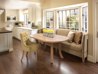 نافذة الخليج عبارة عن هيكل مصنوع خصيصًا لملء مكان فارغ أسفل النافذة. يمكن أن تكون مستطيلة أو نصف دائرية أو غير قياسية. بمساعدة أريكة نافذة الخليج ، تمتلئ المساحة الخالية قدر الإمكان. اختر مواد التنجيد لهذا النموذج في ظل خفيف ودقيق. إذا تم الجمع بين المطبخ وشرفة ، فإن أفضل خيار لوضع الأثاث المنجد مع طاولة هو بالقرب من النافذة. سيخلق هذا الترتيب منطقة طعام مريحة..