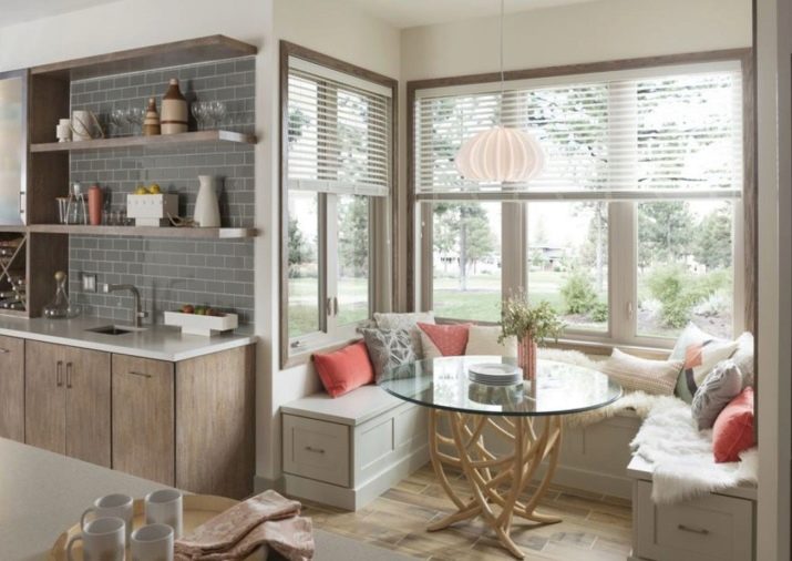 حل مثير للاهتمام هو البناء الناعم مع عداد قضبان. الحلول غير العادية والأنيقة في التصميم الداخلي الحديث هي ما يمنح المساحة أصالة وتفردًا. ينصح العديد من المصممين بوضع مجموعات لتناول الطعام بالقرب من النافذة ومنطقة الجلوس على حافة النافذة إذا كانت واسعة. إذا وضعت هيكلًا ناعمًا بجوار النافذة ، يمكنك الاستمتاع بالمنظر الجميل أثناء تناول الطعام. هذا صحيح إذا كانت المناظر الطبيعية الجميلة مرئية من نافذة كبيرة..